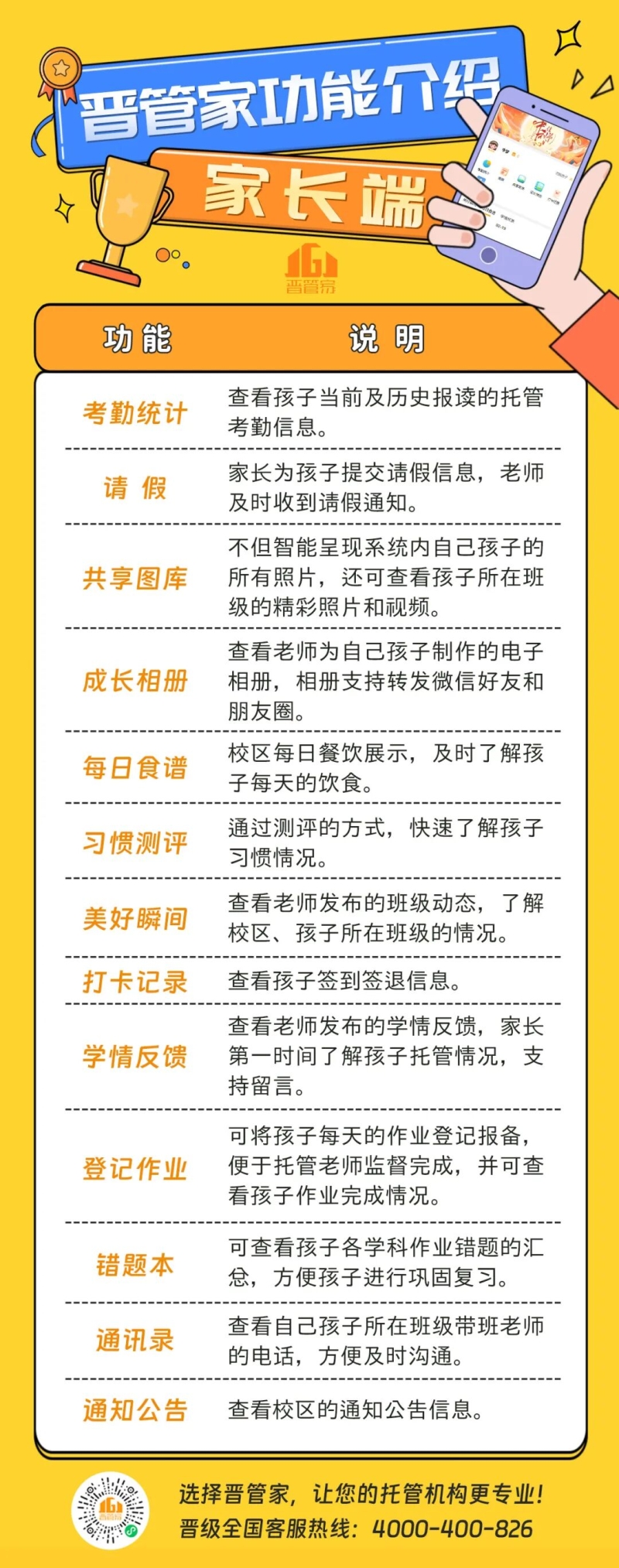 1、提高工作效率借助晋管家小程序,将图片、视频、家校沟通记录和学员管理、员工管理记录转化为一个蕴含丰富信息和见解的机构专属数据库。