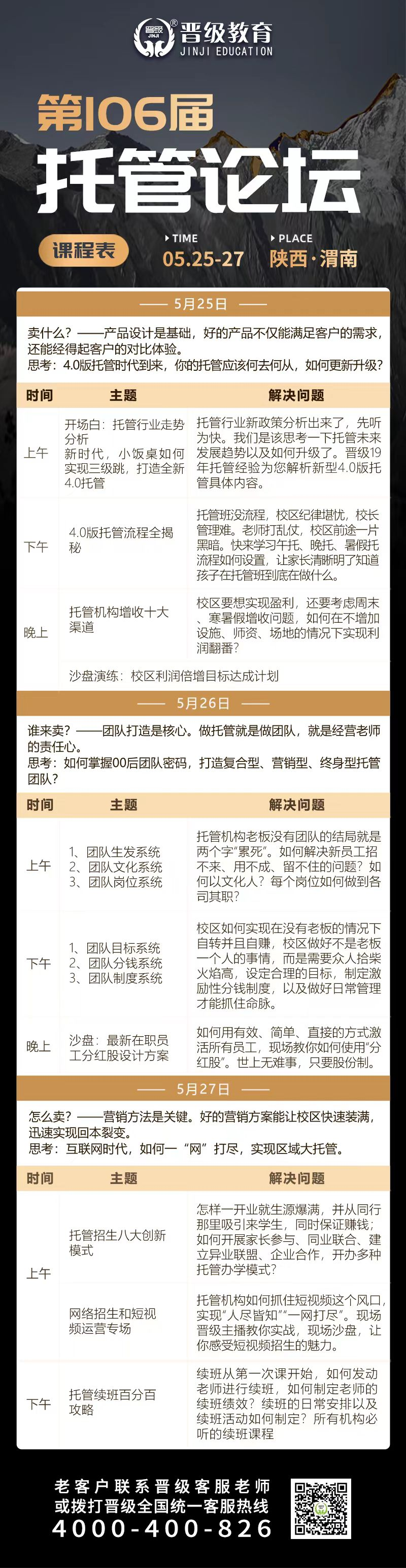 思考:招生作为头等大事,你是否足够重视?你是否做到了推陈出新,你的招生方案够刺激、够完善吗?还有没有可以“一网打尽”的办法呢?当然,不止以上种种,如果你正在为校区转型发愁,正在为寻找托管品牌为难,正在为校区续班忐忑、正在为校区装满头疼,晋级托管论坛绝对是你最好的选择!