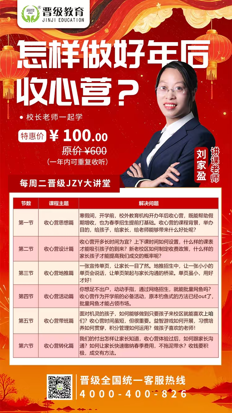别焦虑!本周JZY大课堂晋级高级讲师刘家盈老师带来《怎样做好年后收心营》,从课程设计到招生技巧,从活动安排到带班管理,再到最终转化,全流程干货满满。