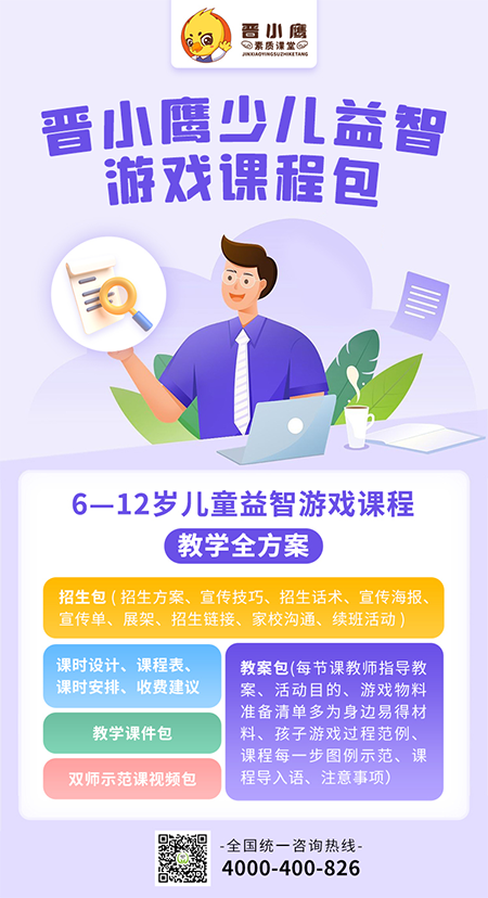 《晋小鹰少儿益智游戏课程》6—12岁玩商开发系列课程涵盖了室内、室外1000多种游戏,每年以200个游戏的速度持续更新。