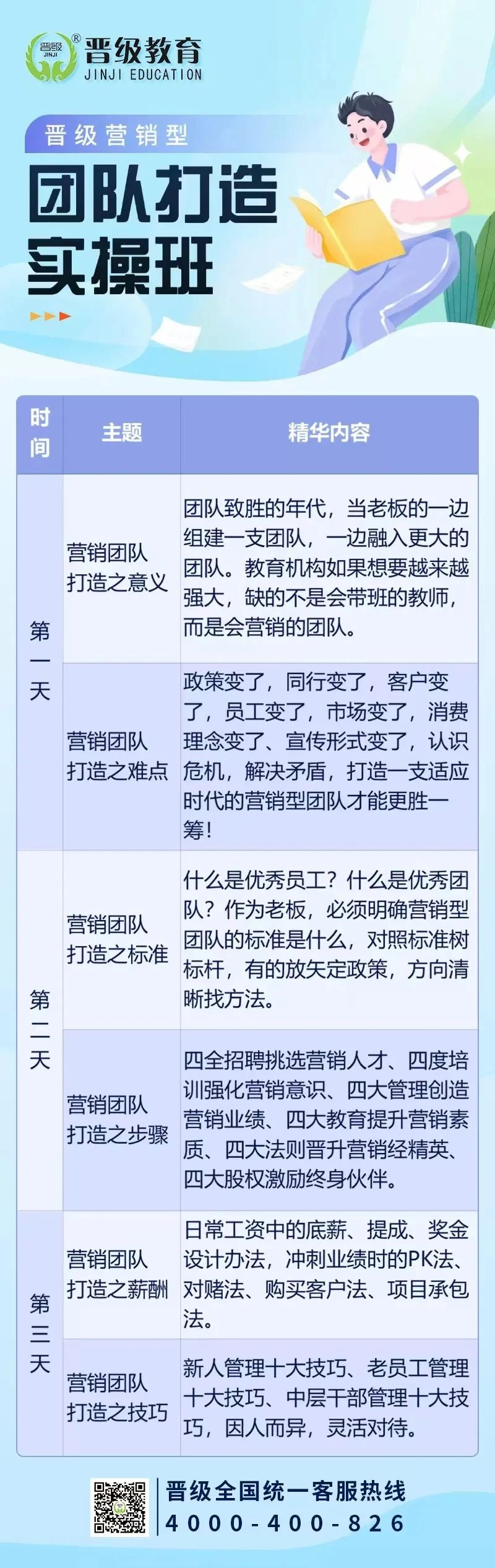 为了帮助加盟校长提高团队打造能力,晋级创始人窦昆老师将面向加盟校主讲系列团队打造内训课,时间自2024年9月到2024年底,每个课程时长均为三天两晚。