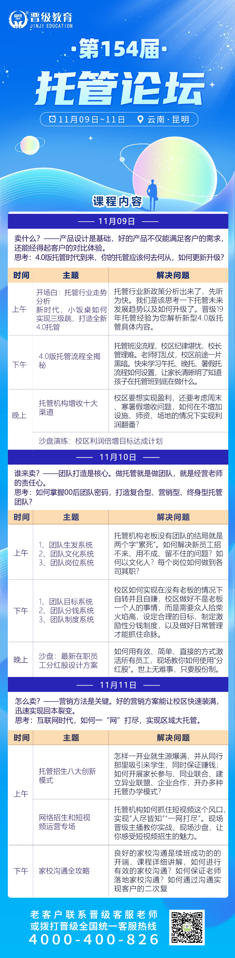 思考:招生作为头等大事,你是否足够重视?你是否做到了推陈出新,你的招生方案够刺激、够完善吗?还有没有可以“一网打尽”的办法呢?当然,不止以上种种,如果你正在为校区转型发愁,正在为寻找托管品牌为难,正在为校区续班忐忑、正在为校区装满头疼,晋级托管论坛绝对是你最好的选择!↓↓↓
