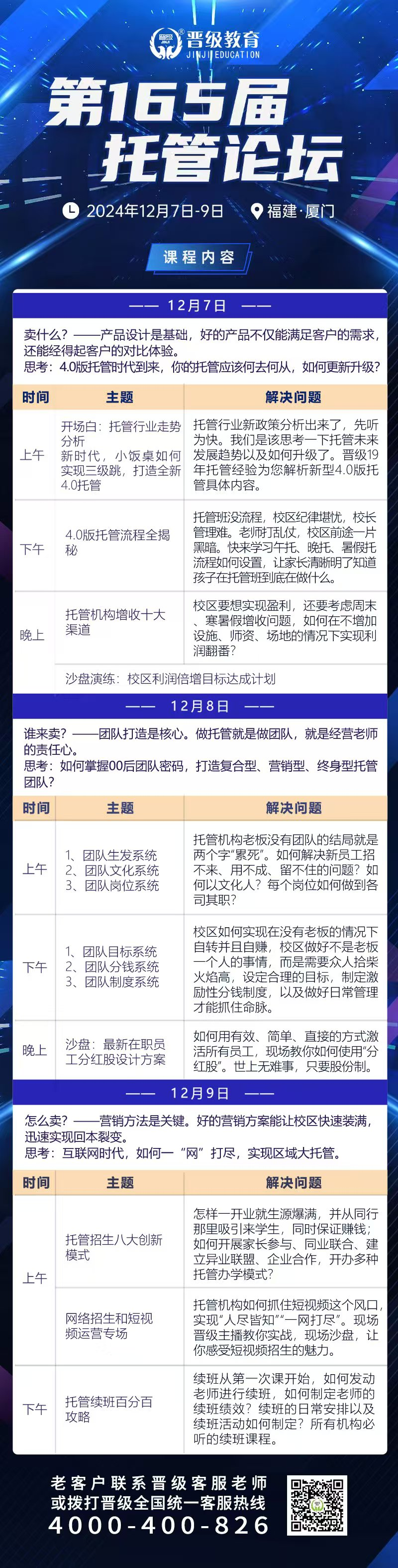 思考:招生作为头等大事,你是否足够重视?你是否做到了推陈出新,你的招生方案够刺激、够完善吗?还有没有可以“一网打尽”的办法呢?当然,不止以上种种,如果你正在为校区转型发愁,正在为寻找托管品牌为难,正在为校区续班忐忑、正在为校区装满头疼,晋级托管论坛绝对是你最好的选择!↓↓↓