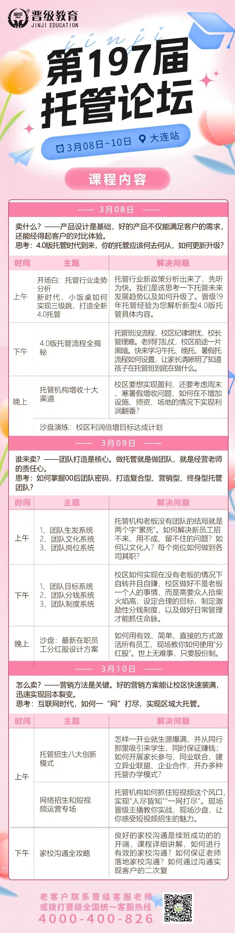 思考:招生作为头等大事,你是否足够重视?你是否做到了推陈出新,你的招生方案够刺激、够完善吗?还有没有可以“一网打尽”的办法呢?当然,不止以上种种,如果你正在为校区转型发愁,正在为寻找托管品牌为难,正在为校区续班忐忑、正在为校区装满头疼,晋级托管论坛绝对是你最好的选择!↓↓↓