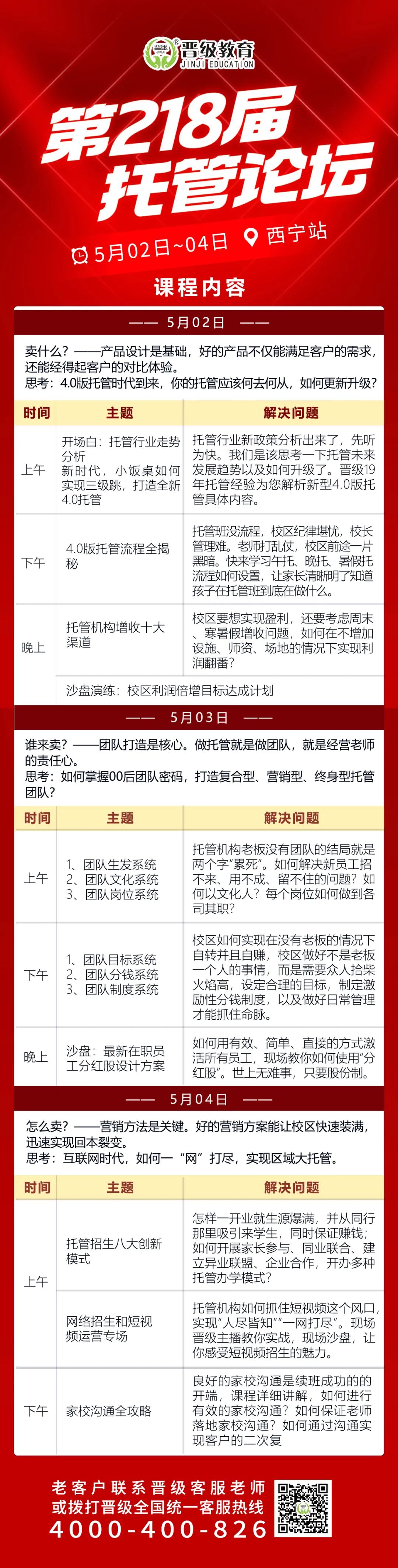 思考:招生作为头等大事,你是否足够重视?你是否做到了推陈出新,你的招生方案够刺激、够完善吗?还有没有可以“一网打尽”的办法呢?当然,不止以上种种,如果你正在为校区转型发愁,正在为寻找托管品牌为难,正在为校区续班忐忑、正在为校区装满头疼,晋级托管论坛绝对是你最好的选择!↓↓↓
