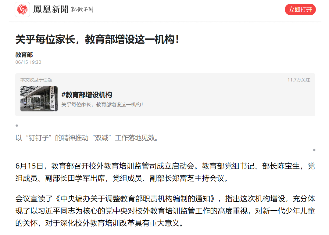 凤凰网等网站转发这条消息时,用的标题是《关乎每位家长,教育部增设这一机构!》。是否关乎每位家长我不敢确定,但是,可以断定的是,此举一定关乎每一位从事校外教育培训行业以及打算从事这个行业的投资人。